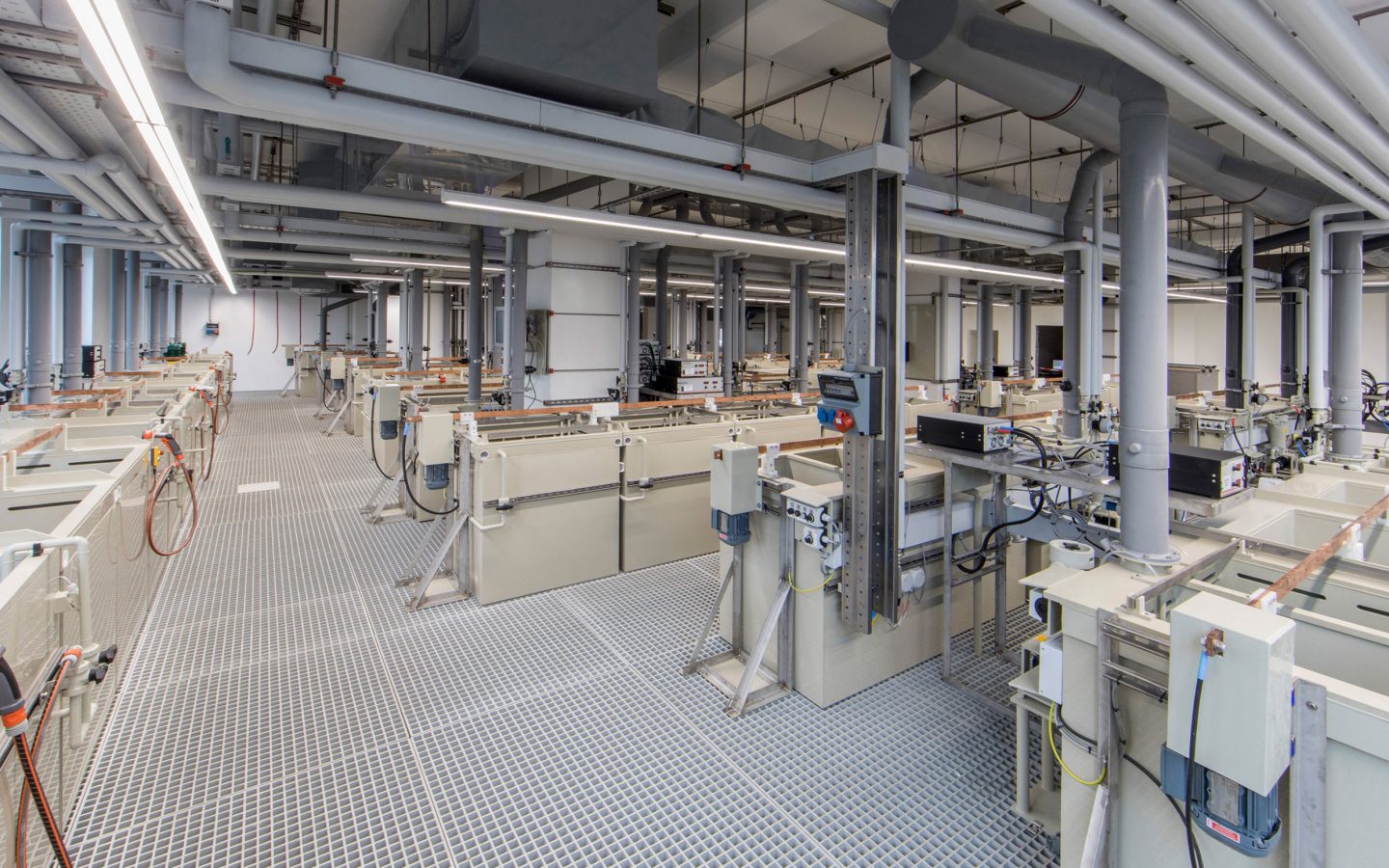 Neben den rund 70 Aktivbädern steht auch eine Vorbehandlungslinie mit mehreren Bädern zur Verfügung. Je nach Reinigungsaufgabe, beispielsweise Entfernung von Bearbeitungsölen und -fetten, Spänen, Partikeln, Polierpasten und Zunder, wird hier ebenfalls mit unterschiedlichen Chemikalien gearbeitet. Die hohe Flexibilität wird durch die integrierte Ultraschalllösung von Weber Ultrasonics unterstützt.